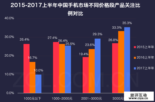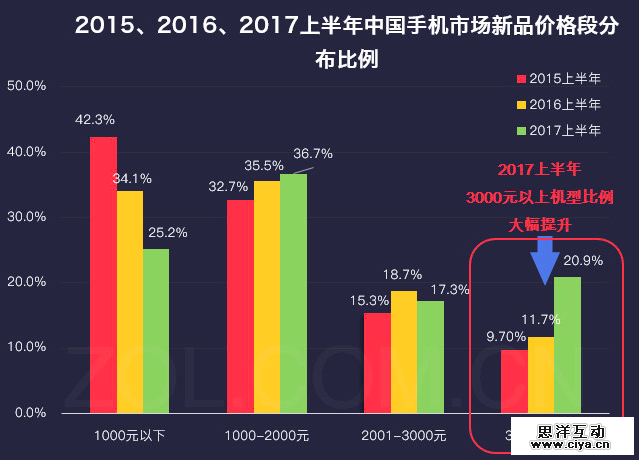 而在用户关注度方面,2017年上半年,中国手机市场价位在2000元以下的产品关注度大幅下降,2000以上的产品关注比例均大幅提升。其中,3000元以上从2015年的26.8%上升到了35.3%。