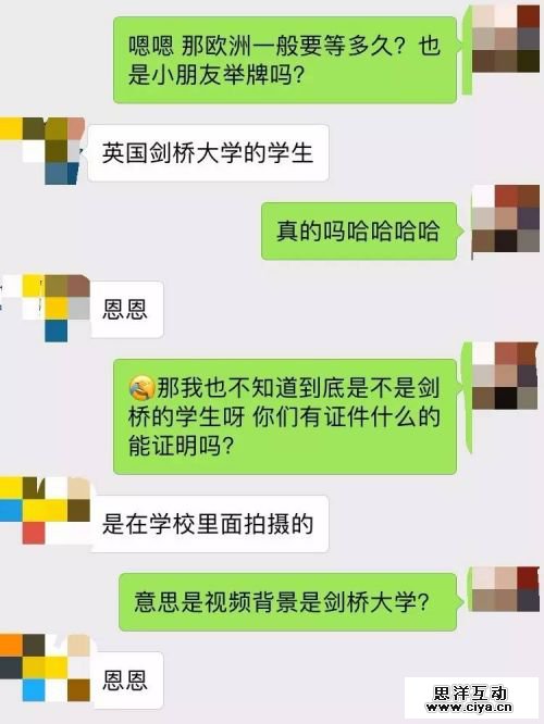 除了非洲的举牌视频,还有卖欧美举牌视频的卖家。一位卖家告诉中企哥,欧洲的举牌视频价格要贵上不少,根据顾客需求在1000—2000元不等,而且等待时间比非洲的长,大约需要一周。接下来的一句话让中企哥惊呆了。店主说,欧洲的视频由英国剑桥大学的学生举牌。