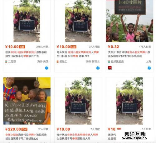 一位淘宝店主告诉《中国企业家》,20元的是一张非洲小朋友举牌的照片,200元则是一条非洲小朋友举牌喊话的小视频,10元价格的宝贝是让买家按需求拍下的,例如买家想要一张照片,就拍两个10元的宝贝。一般来说,非洲小朋友视频的到货需要至少一天时间。