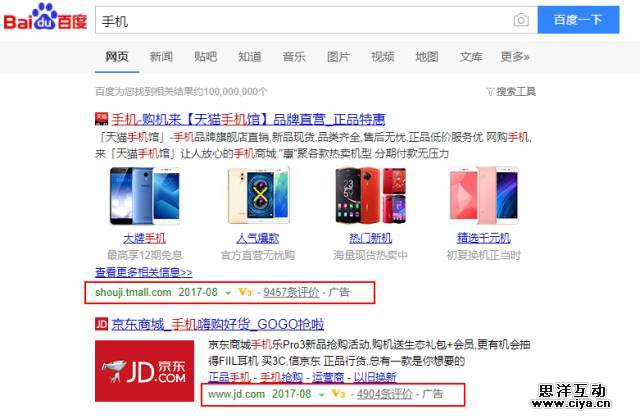 比如我们在百度中搜索“手机”,结果页最前面的两个广告,分别了来自天猫和京东。当用户通过链接进入商品页面时,我们在浏览器地址栏中,可以看到一长串的字符,一方面用于记录广告主投放广告的来源,另一方面对于下单完成销售的订单,可以用来评估投放效果,甚至给到流量主部分提成,视双方合作业务而定。