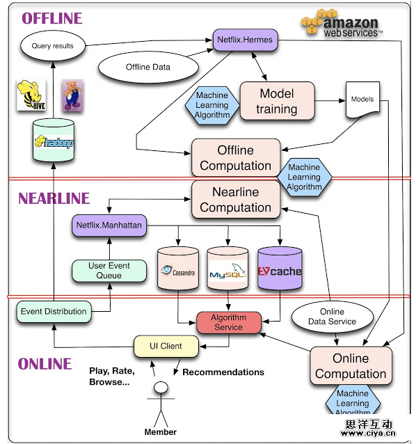 另外,我们可以注意到,Netflix在进行内容推荐运算的时候使用的是三种计算方式相结合:在线计算、离线计算和接近在线计算。