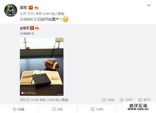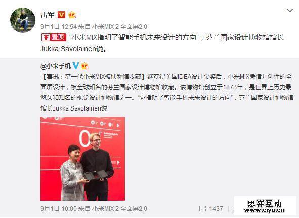而随着小米MIX2消息的放出,雷军还在9月1日的一条微博中转载了官微消息:小米MIX凭借开创性的全屏设计,被全球知名的芬兰国家博物馆收藏。该博物馆为知名视觉设计博物馆,能够被它收藏足见小米MIX在设计方面的影响力。博馆馆馆长更是褒奖道:它指明了智能手机未来设计的方向。拥有小米MIX一代的朋友们应该开心了,毕竟你们拥有了一台世界知名博物馆珍藏的同款手机(哈哈)。