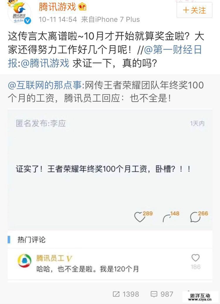 随后,腾讯游戏官方微博出面辟谣称:“这传言太离谱啦~ 10 月才开始就算奖金啦?大家还得努力工作好几个月呢!”尽管官微出面打破传闻,但网友心中却自有其想,毕竟早在去年,全年收入 68 亿的《王者荣耀》一举夺得MOBA手游霸主之位,腾讯互娱也霸气拿出约 1 亿人民币奖金犒赏员工,王者荣耀项目组人均分得 140 万元,最低分红 60 万元,核心员工更是最多分到了 290 万元人民币。彼时《王者荣耀》日活跃用户数 4000 余万,而截至今年 5 月,这个数字已经达到了5412. 8 万。 100 个月工资并不是无稽之谈。