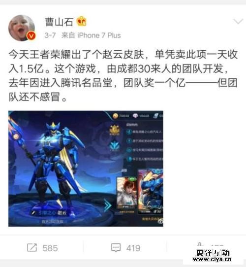 而凭借着《王者荣耀》巨大的用户流量,就是这一款几十块至上百块的“皮肤生意”便能够为《王者荣耀》带来日入过亿的业绩。著名财经博主曹山石于今年 3 月在微博爆料,游戏中新出的赵云皮肤一天便为腾讯游戏带来1. 5 亿元收益。