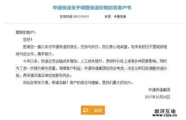 中通快递宣布,快递业受运输成本增加、人工成本提升、原材料价格上涨等多种因素影响;同时为了进一步提升服务质量,保障客户利益,中通快递集团经综合考虑,决定从即日起调整快递价格。
