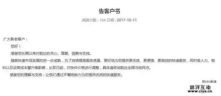 韵达快递也紧随中通,在其官网发布告客户书,称快递市场发展进一步成熟,受人力、物料以及运营成本攀升等影响,从即日起,对快件价格进行调整,具体请咨询韵达全国当地网点。