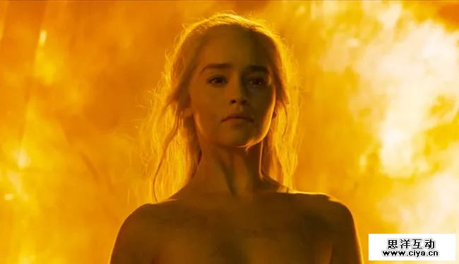 第六季中龙母浴火重生,图自:Maxim 这样的情况在第六季的时候也曾出现,而且在第六季 Pornhub 还反过来利用 《权力的游戏》为自家的流量做贡献,Pornhub 在网站上传了龙母扮演者 Emilia Clarke 在第六季中的裸戏,让网站的流量一度大涨了 340 %。