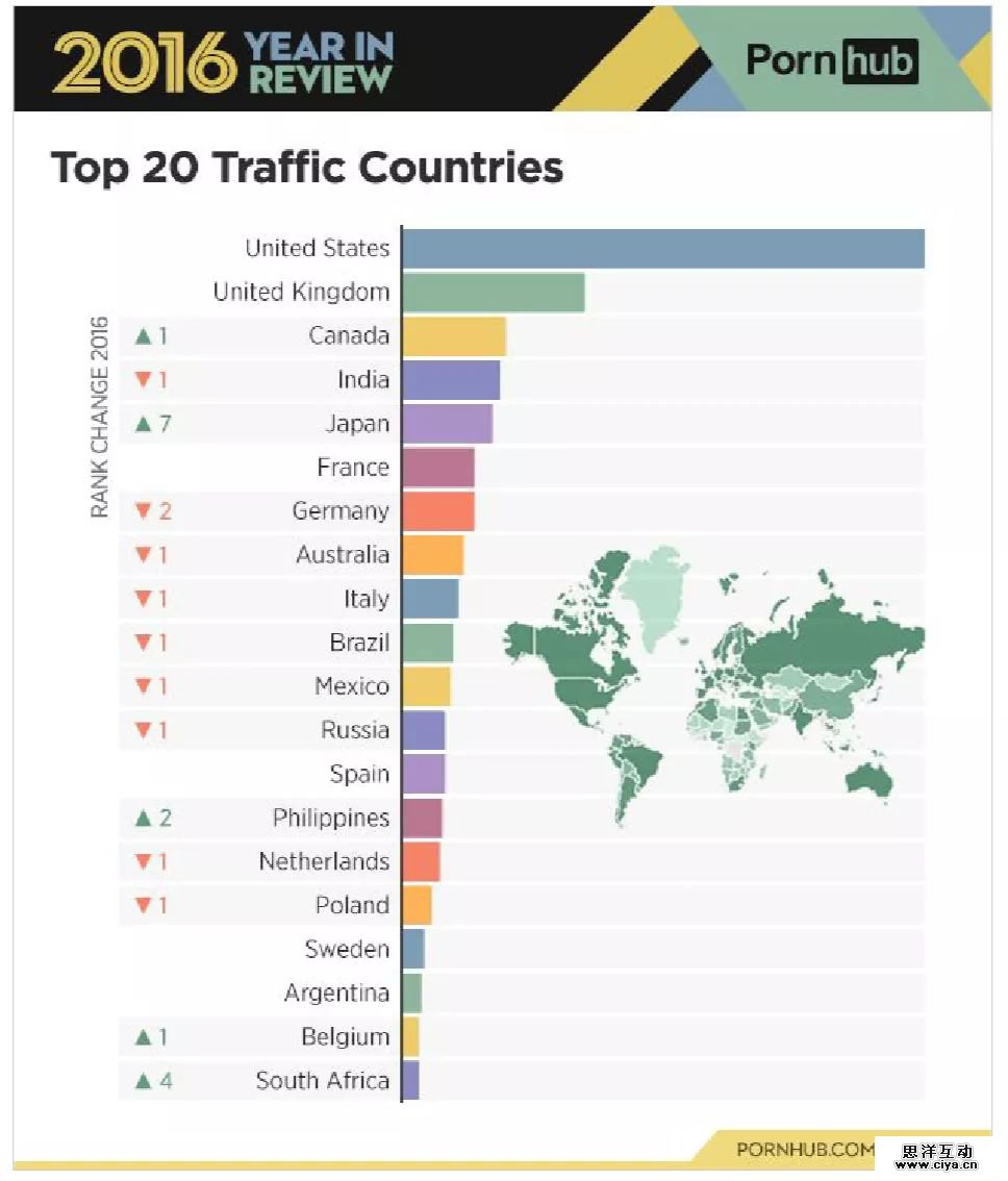 其中美国、英国、加拿大、印度和日本是 Pornhub 访问量最大的 5 个国家。