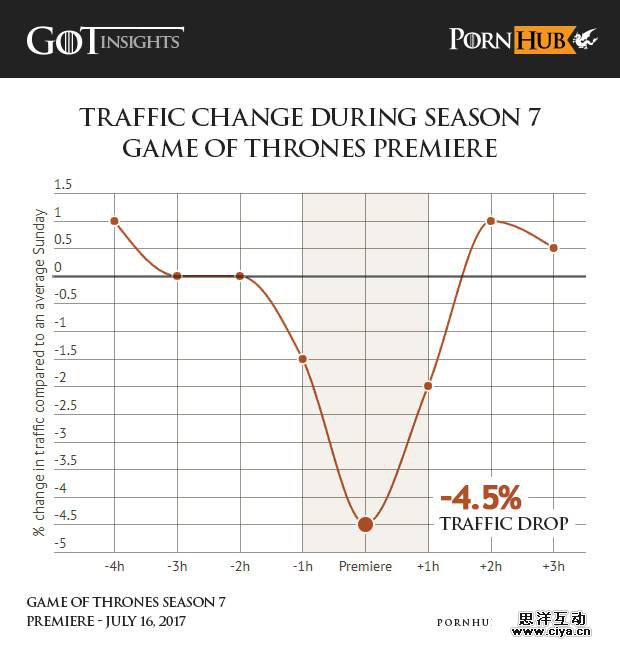 《权力的游戏》最终季首播是在美国时间周日晚上,在平时这是 Pornhub 网站上访问最活跃的时间,可龙母的魅力显然更大,在首播当晚 Pornhub 的网站流量下跌了 4.5%。