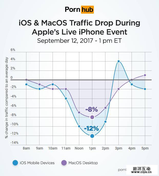 苹果的秋季新品发布会在9 月 12 日美国东部时间下午 13 时开始,根据 Pornhub 发布的数据,其网站流量在发布会一开始就下降了 7 %,当天的流量则比日均流量下降了 4 %。