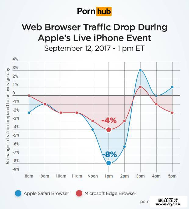 来自 Safari 的流量也涨到比平均值高出 3 %,至于是不是新 iPhone 让老司机们特别兴奋就不得而知,而去年的苹果发布会期间 Pornhub 的网站流量也出现了类似的波动。