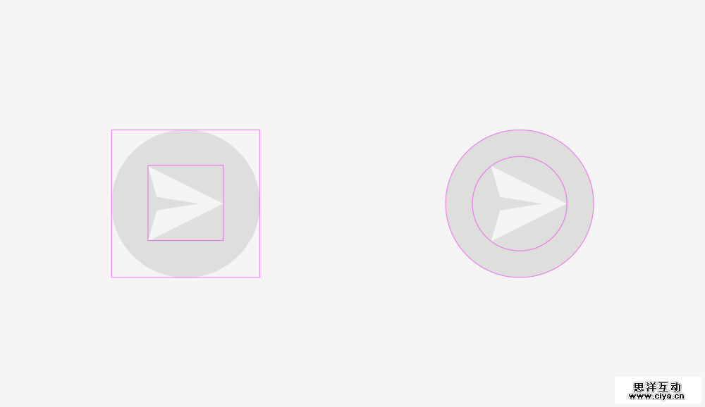 可能你已经注意到上图左边的按钮看上去不太对劲。这是因为不同的对齐方式引起的。第一个按钮把三角形的图标当成了矩形。在某种程度上它是对的,因为当你把SVG或PNG格式的图标发给研发时,研发会把它放在一个正方形的区域里。而第二个按钮在放置图标时保证图标每个角到圆形按钮边缘一致。如下图所示。