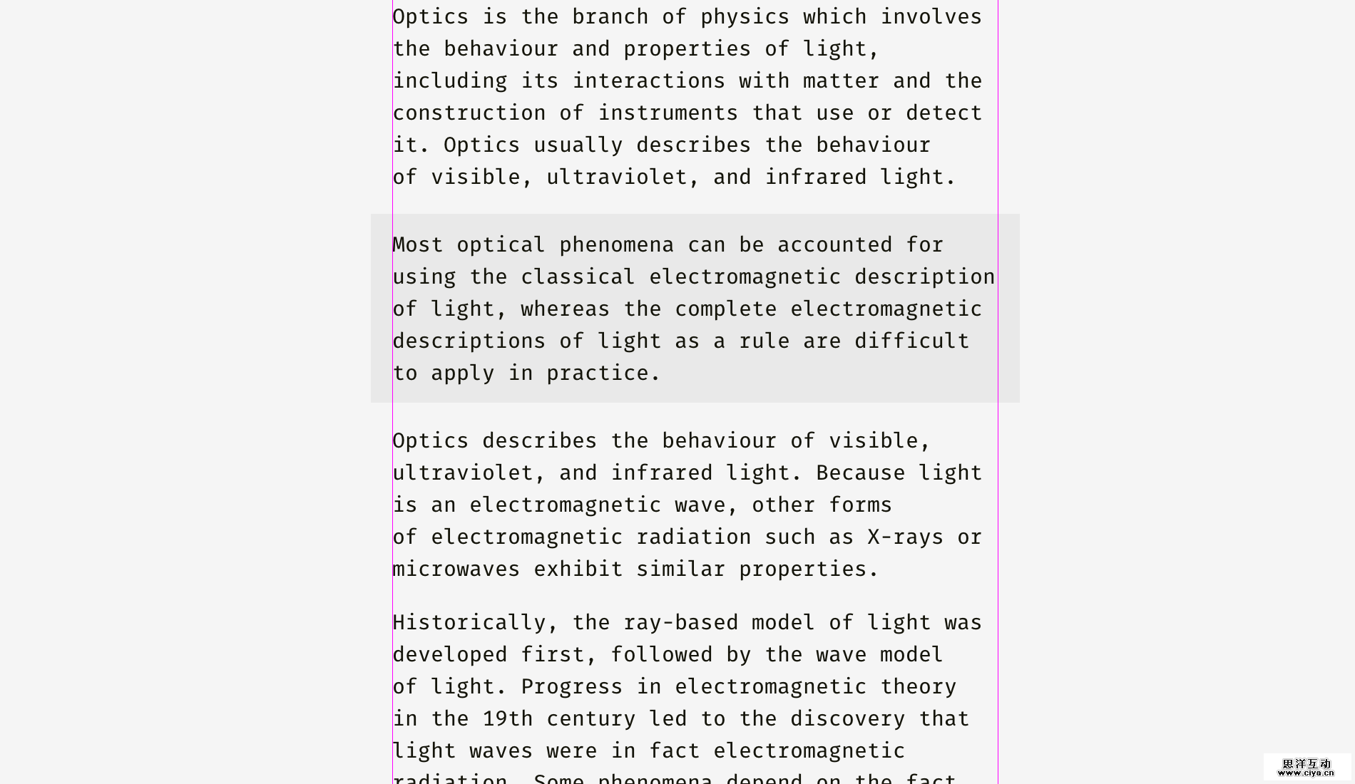 为什么要这么做呢?和明亮的背景色不同的是,黑色的背景色有大量的视觉重量,如果把它放在段落中间,和其它的段落间距没什么区别,那么最好的放置方式是和文字对齐,而不是突出一部分。