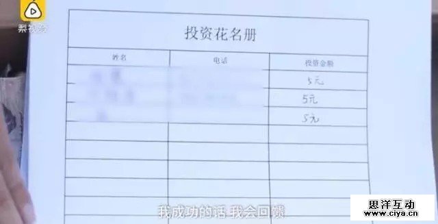 他说:“在我需要帮助的时候,如果别人能我帮助。我成功的话,我会回馈社会。”为此他还专门制作了一张《投资花名册》,上面列举了“投资人”的姓名,电话还有投资金额。