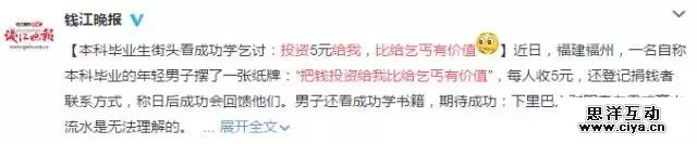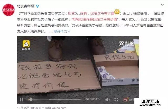 近日,在福建福州,一名自称本科毕业一年的年轻男子在天桥上摆了一张纸牌:“把钱投资给我比给乞丐更有价值”,每人收5元,还登记捐钱者联系方式,称日后成功会回馈他们。