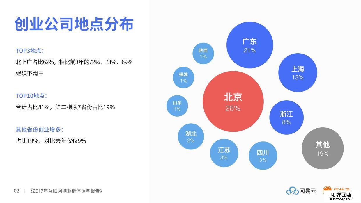创业公司在地点分布上,北上广占比 62%,相比 3 年前的 72%、73%、69% 继续下滑中,创业的种子正在遍地开花;