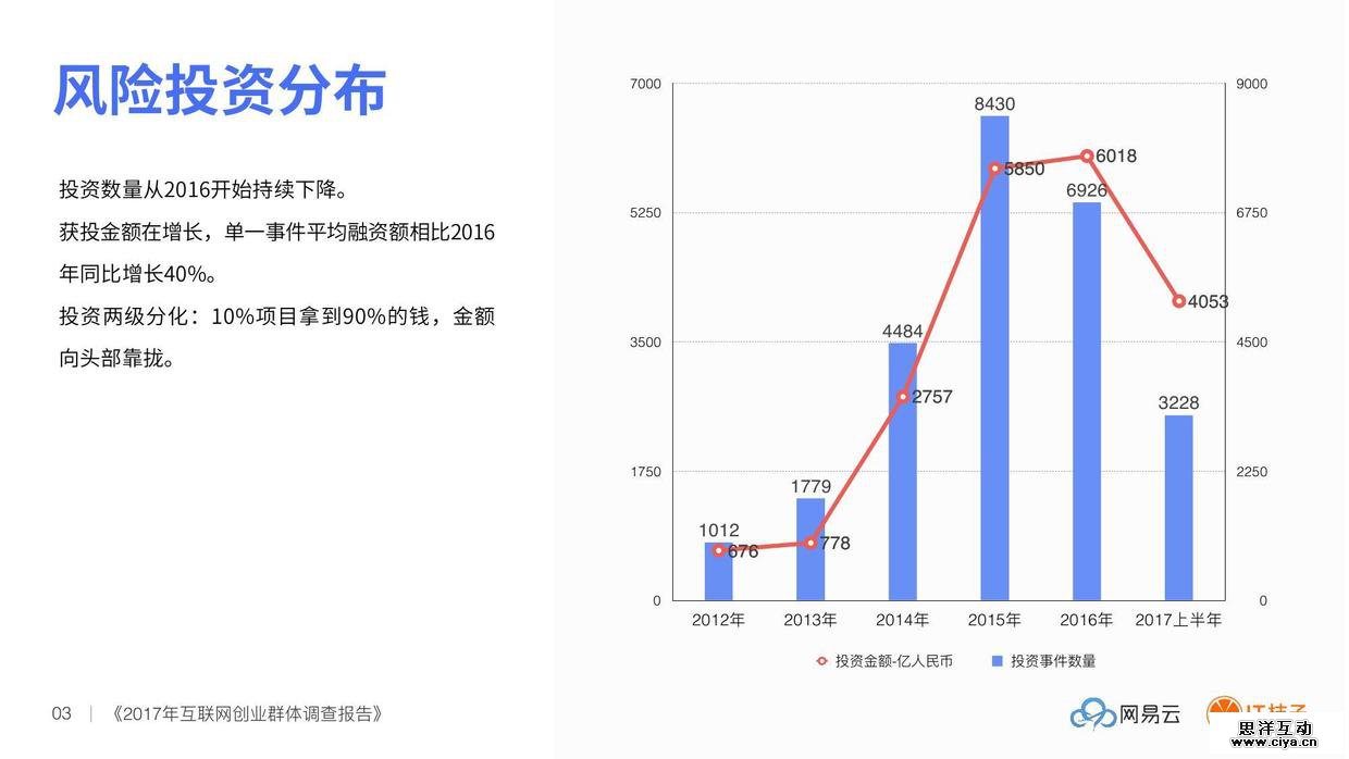 2017 年的创业方向更加分散:电商/O2O、文化娱乐依旧是热门行业,企业服务、云计算/大数据/人工智能相关领域开始热门,有增多趋势;