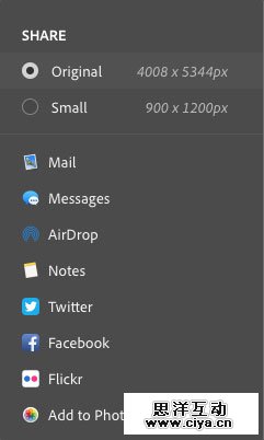 第二招,共享文件。在早几个版本的时候,PS已经支持通过软件把图片分享到Behance网站,而最新版中,对此项功能做了更强大的优化,添加了“文件>共享”功能,集合了很多社交App,而且可以继续从商店下载更多可用应用。操作简单方便易上手,如下动图演示为win系统的共享界面,再往下图为mac版PS的共享界面。