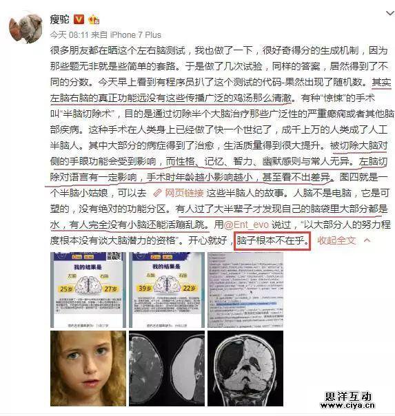 除此之外,有果壳网的主笔@瘦驼在微博分享了自己对于这个测试的见解。他在微博写道“左脑右脑的真正功能远没有这些传播广泛的鸡汤那么清澈...”,随后还举例了进行“半脑切除术”的例子。
