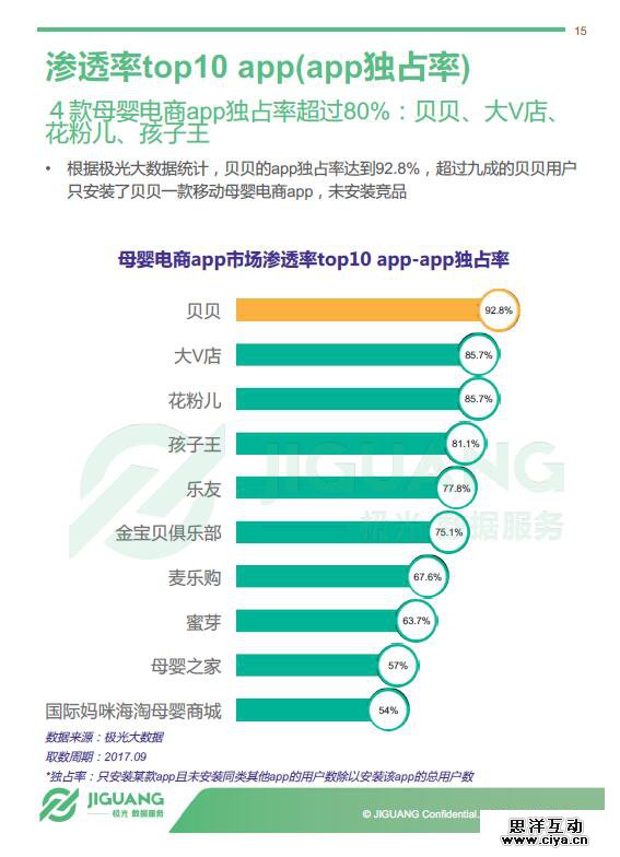 - 根据极光大数据统计,贝贝的app独占率达到8%,超过九成的贝贝用户只安装了贝贝一款移动母婴电商app,未安装竞品