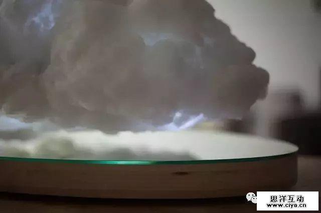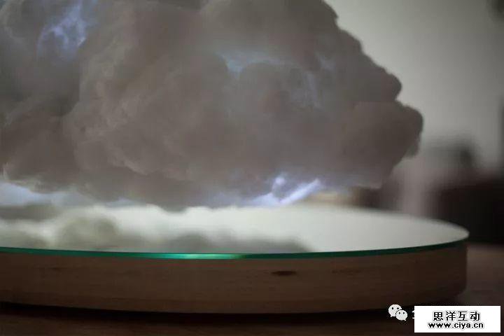 云朵不仅会小幅度地上下浮动、进行 360 度 旋转,配合能营造出雷电效果的 LED 灯以及底座顶部的镜面,营造出更逼真的自然现象,放在室 内显得相当别致