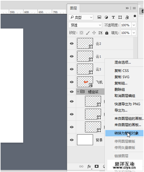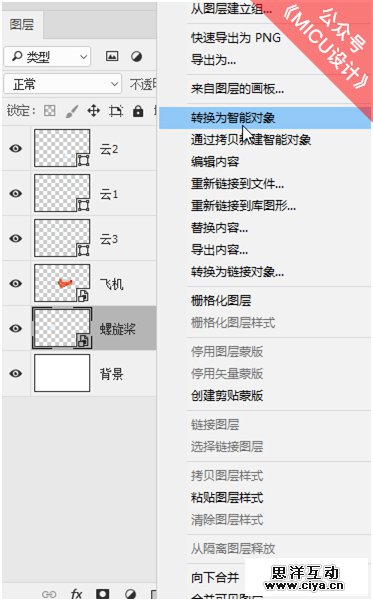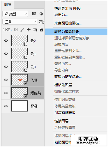按住Shift键同时选择“飞机”、“螺旋桨”图层,然后鼠标右键选择“转换为智能对象”,此时我们发现两个图层合并成一个图层。