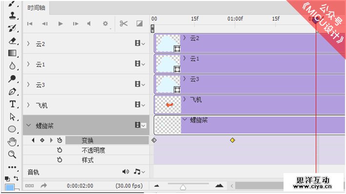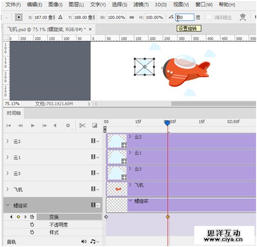 将时间轴上的指示器拖到2:00f位置,再次按Ctrl+T组合键进行180度调整。螺旋桨就可以完成一个360度旋转的动画效果。