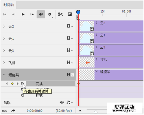 适当的调整飞机的上下位置,在时间轴中适当的位置添加关键帧。