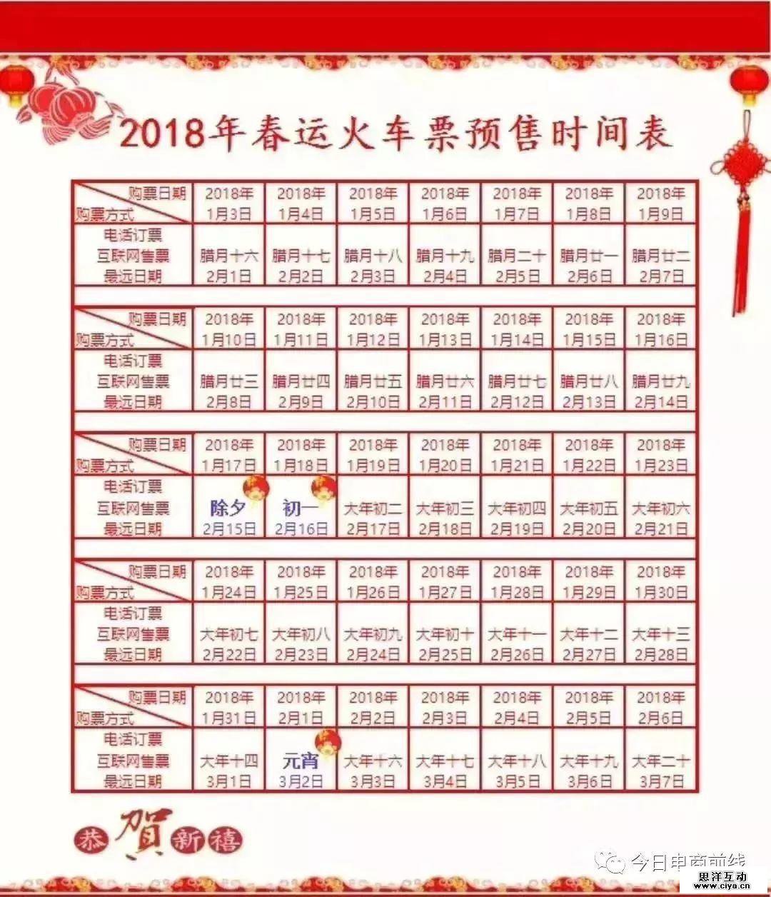 近日,中国铁路客户服务中心发布公告称,全国铁路新运行图编制工作已全部完成,自12月12日起,全国主要干线旅客列车车票互联网、电话订票预售期恢复为30天。12月12日恢复火车票预售期后,旅客就可以购买元旦火车票。那么2018春节火车票怎么买?1月17日就可以抢除夕的火车票,更多戳下图↓