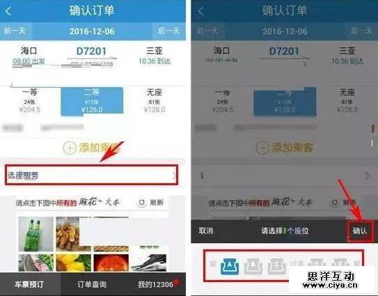 2、然后在选择好软硬卧坐席后点击界面中的【选座服务】,随后选择相应的靠窗座位,点击【确认】;