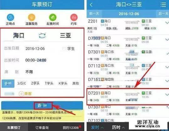 1、点开铁路12306手机客户端,首先在“车票预订”界面完成始发地与终点站、出发时间与乘客信息,点击【查询】,然后选择所要搭乘的列车班次;