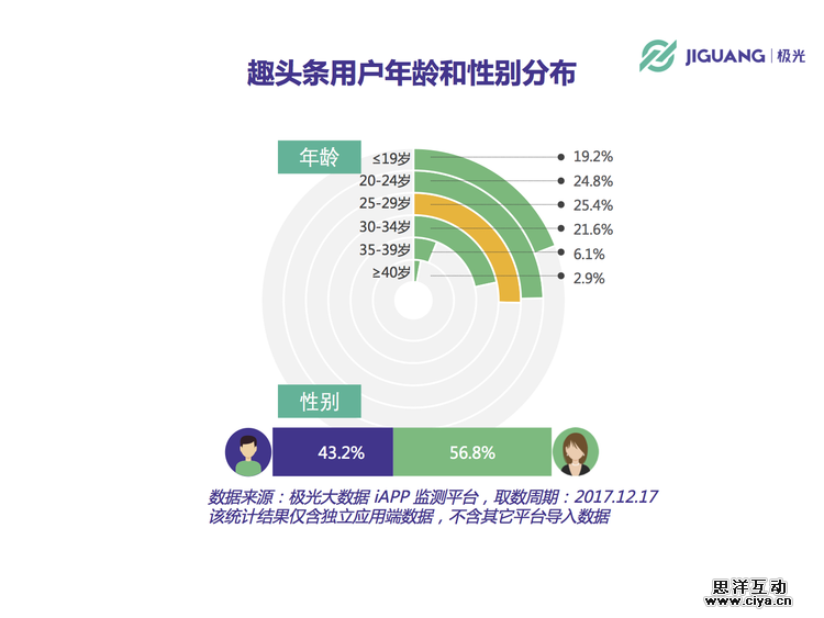 根据极光大数据的统计显示,趣头条用户中 30 岁以下的青年人和年轻人占 69.4%,而作为一款新闻阅读类客户端,趣头条的女性用户高于男性。而在地域分布上,二、三、四线城市的用户合并占比超过 90.15%。