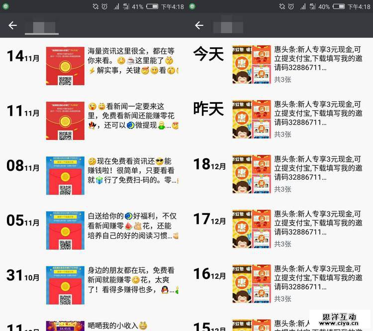 类似的收徒模式不止在趣头条一家使用,我的一个学妹向我展示了她母亲的朋友圈截图,其中左侧是在她母亲沉迷趣头条时的样子,而右侧则是她母亲下载了另一个叫惠头条 App 之后。
