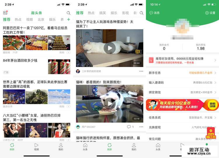 趣头条的主界面没有什么新奇,但当你点开「我的」标签,就会发现另一个世界。