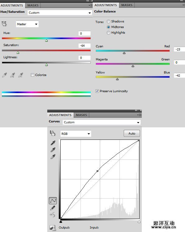 在这一步中,我们将会用到很多调整图层,例如色相/饱和度调整图层、色彩平衡调整图层、曲线调整图层及其剪贴蒙版,以减少主体的饱和度,使之更亮: