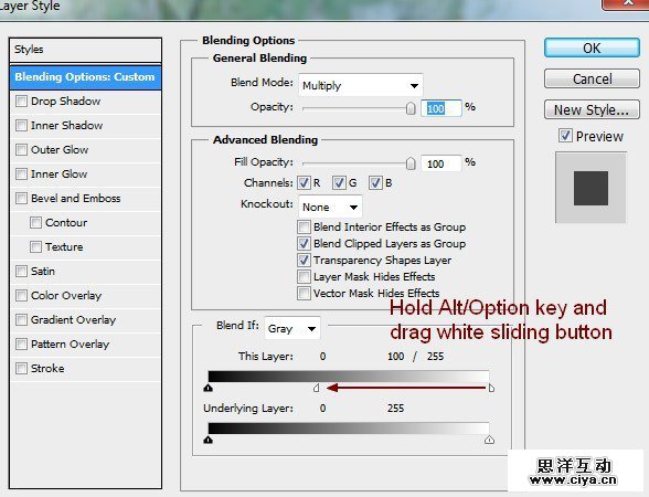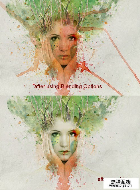 右键单击图层,选择混合选项,按住Alt/Option键的同时拖动如图所示的白色调节按钮,减少水彩4的效果,然后用图层蒙版去掉头部周围的效果,防止主体被遮住。