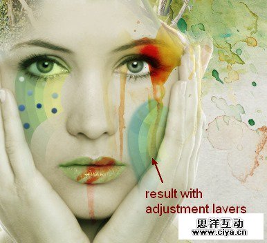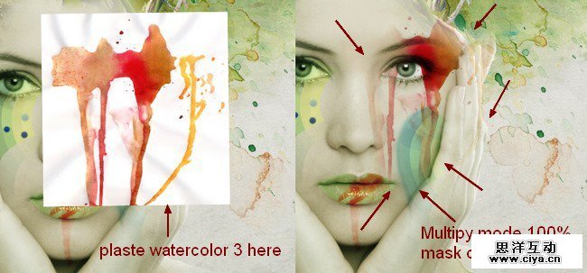 打开图片水彩3,做过旋转变化和大小调整后,将之移动到右眼区域,将混合模式设置为 正片叠底 100%,使用图层模板,以获得褪色效果: