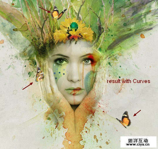 将蝴蝶的图层建立为图层组,将图层组的混合模式设置为 正常 100%。在组内新建一个曲线调整图层,为蝴蝶提亮: