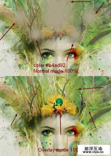 在所有图层上方新建一个图层,利用颜色为#b4ad92的柔软笔刷为主体头部提亮,使得元素之间融合得更好。将图层混合模式设置为 叠加 100%: