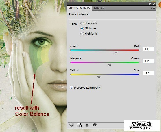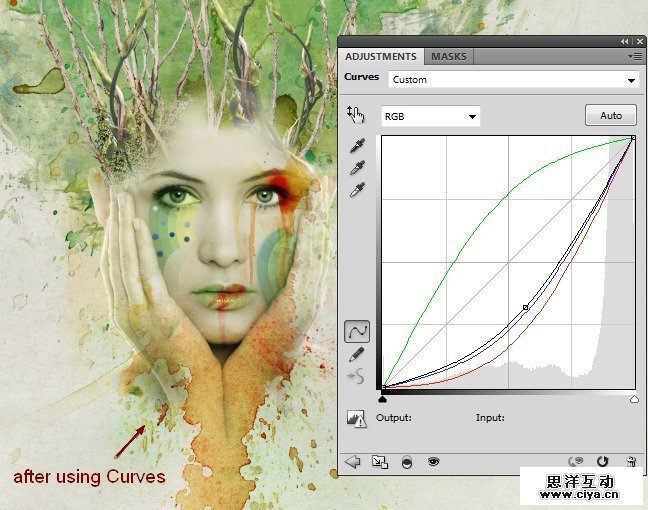 我将会使用曲线和色彩平衡调整图层(勾选 使用前一图层剪切蒙版)来调整前一步中的水彩效果: