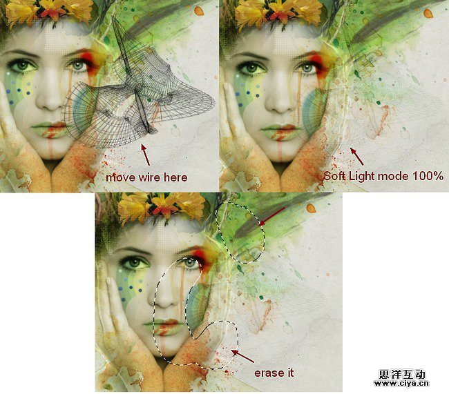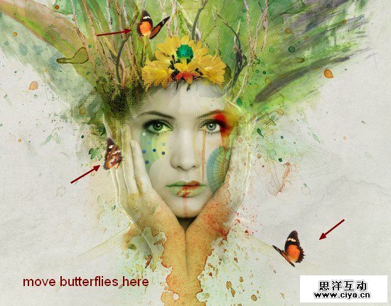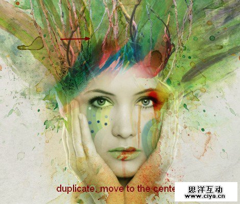 打开图片水彩5(图片包),选择如图所示的水彩图,将之移动到主体头部右上方,利用图像→变换→扭曲,使之弯曲: