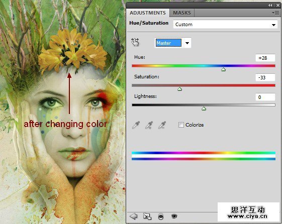 在这一步中,利用色相/饱和度调整图层来调整花的颜色: