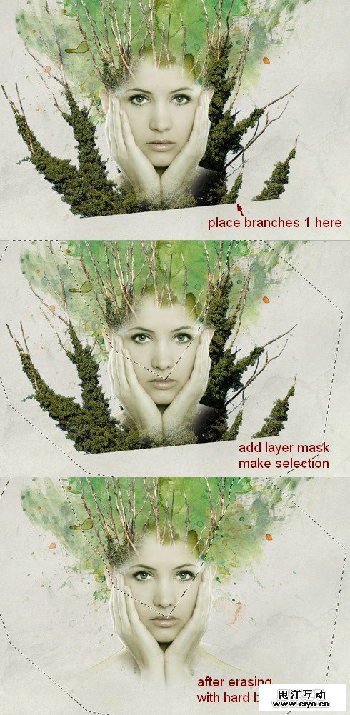 打开图片树枝2。把图示部分抠出后,放在主体头的右上方,再复制两次,并命名为1、2、3。将名字为2和3的树枝水平翻转,并将它们放在主体头的周围。再一次利用图层蒙版来使树枝和头部融合: