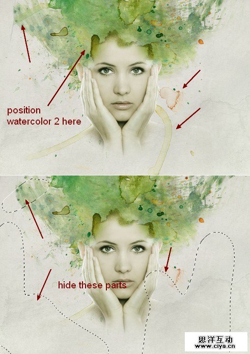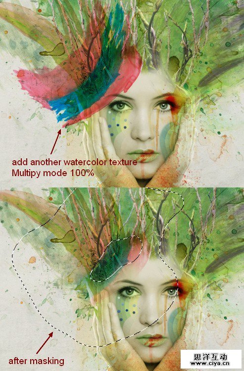 在这一步中,我们将要在主体头部左侧添加一个彩色的水彩纹理,不过比刚才的位置要低一些。一样的,混合模式设置为 正片叠底 100%,再利用图层蒙版去掉不需要的区域: