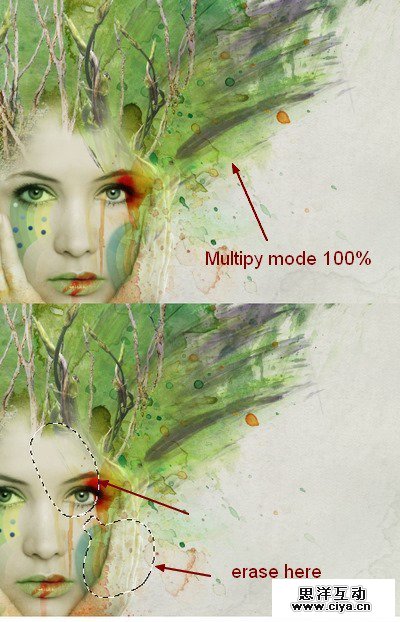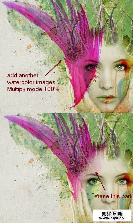 现在我们将会添加另一个水彩图像至主体头部左侧,仍是将混合模式设置为 正片叠底 100%,并去掉不需要的部分: