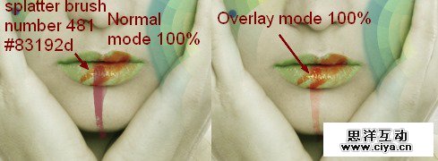 再新建一个图层,使用第481号飞溅笔刷在嘴唇和下巴上画一笔,颜色为#83192d,将其混合模式设置为 叠加 100%:
