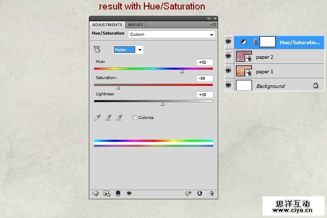 不过还需要一个色相/饱和度调整图层来调整一下此效果的颜色: