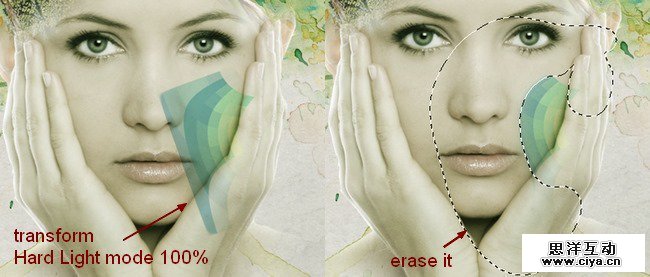 将上一步的结果转换为智能对象,然后将其缩小并将混合模式更改为强光 100%。按键Cmd/Ctrl+T,将其旋转并移动到主体的右脸颊上,最后仍然是利用图层蒙版去掉不需要的部分。