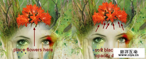 打开图片花,选择移动工具,将之拖动至主体前额。然后在花图层下新建一个图层,用柔软的黑色画笔,透明度大约为40-50%,在花的下方为之绘制阴影: