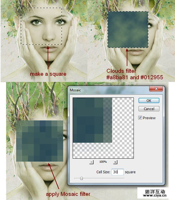 在所有图层之上新建一个图层,将前景色设置为#a8ba81,后景色设置为#012955。选择矩形选框工具,在画布上创建一个正方形选区,然后点击 滤镜→渲染→云彩。在应用云彩滤镜之后,点击 滤镜→像素化→马赛克: